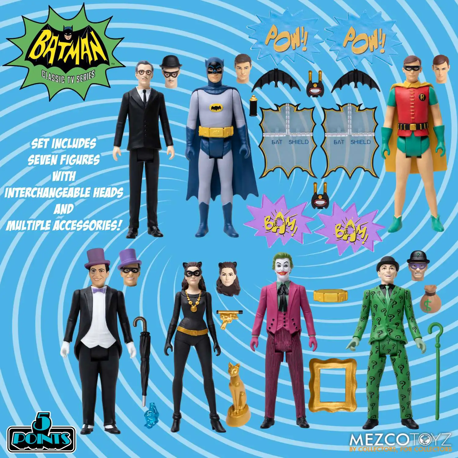 The 5 Points Batman (1966): Deluxe Boxed Set contains everyones favorite crime-fighting duo and a variety of Gotham Citys most notorious villains, each complete with their own interchangeable heads and accessories.
