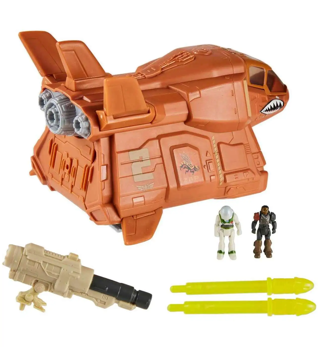 Discover Disney Pixar’s Lightyear. Stranded on an uncharted planet, Buzz Lightyear and his crewmates will need to battle hostile plants, giant bugs and the ultimate threat, Zurg, to complete their mission and return home. This vehicle is inspired by Star Command’s uniquely shaped Armadillo spaceship that plays a key role in Lightyear. It comes with figures of Izzy and Buzz at the same scale, ready to recreate thrilling air battle scenes or center a dramatic Lightyear display. Both of these sector protector figures fit in the cockpit seats and the back door folds down to reveal a platform where the blaster can be attached and loaded with the 2 projectiles. The landing gear folds down to come in for a soft arrival and the nose of the jet includes an intimidating shark mouth that glows in the dark! Fans will want to collect all the Lightyear toys to relive the entire thrilling space saga. Colors, dimensions and decorations may vary.