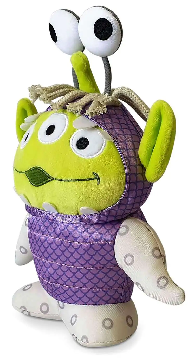 It’s scary how cute one of the Toy Story Aliens looks when transformed into the adorable little Boo from Monsters, Inc.. Dressed in Boo’s sea monster costume, this Alien is part of a collection featuring the Pizza Planet plush as popular Pixar characters.