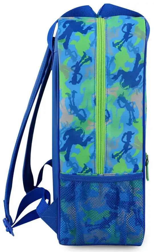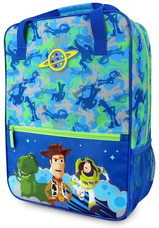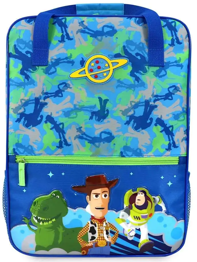 The toys are back in town as Woody and Buzz Lightyear team up with Rex on this Toy Story Backpack. The trio are featured in the vinyl appliquΓ© and the allover camo print while the Pizza Planet appliquΓ© provides a delicious slice of color.