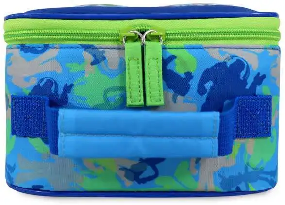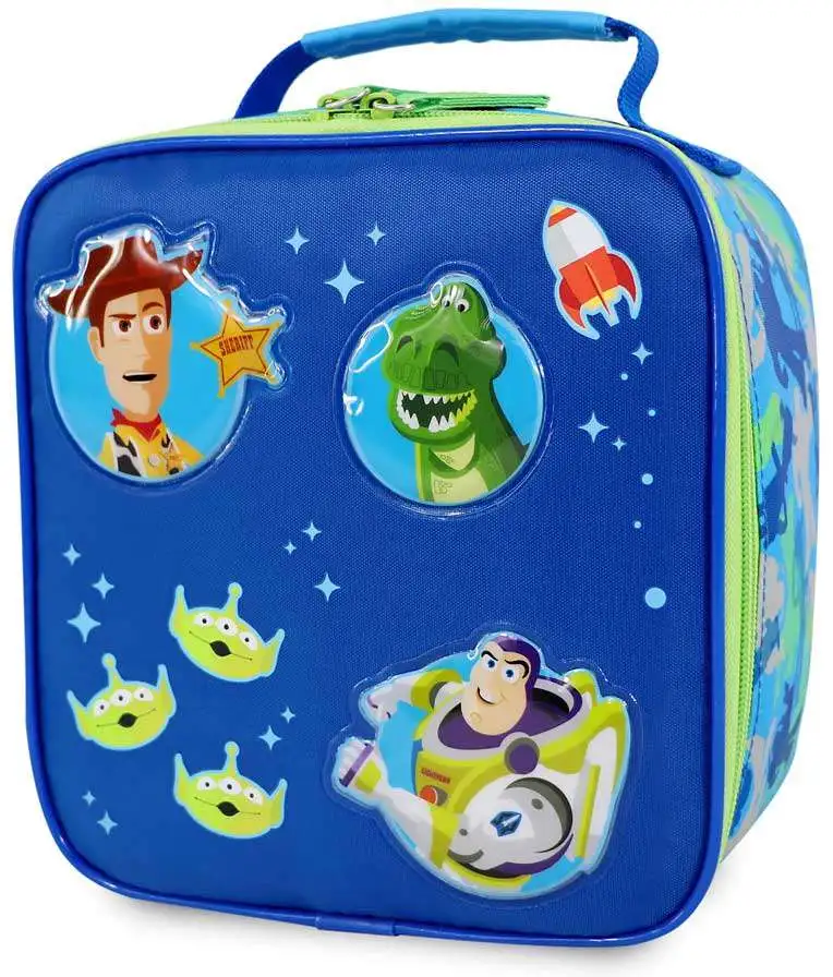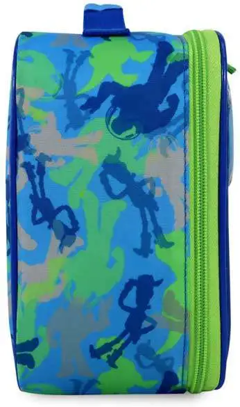 The toys are back in town as Woody and Buzz Lightyear team up with Rex and a trio of space aliens on this Toy Story Lunch Box. The front features vinyl appliquรฉs while the side and back has an allover camo print to whet their appetite.