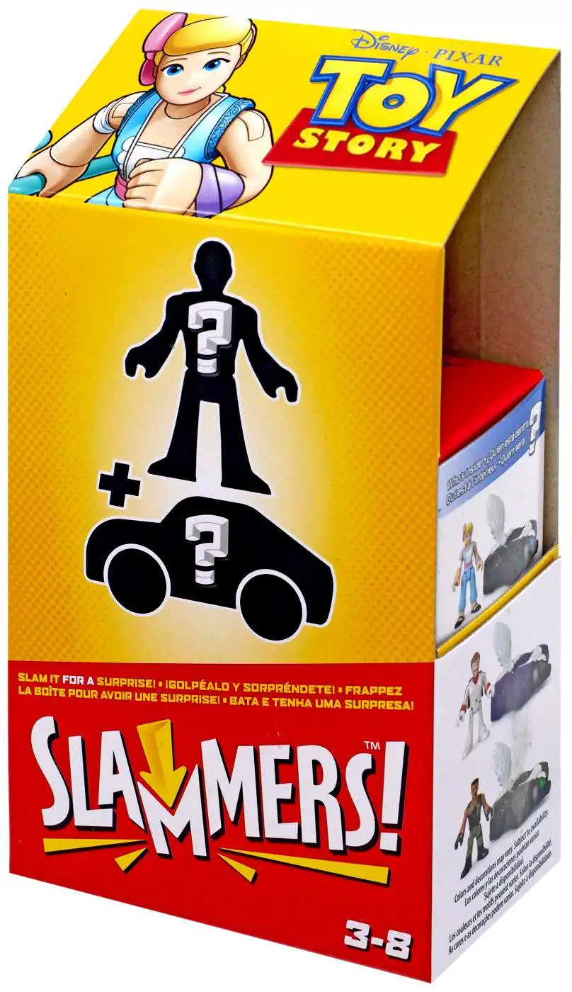 Preschool kids can really get in on the action with this Toy Story Slammers vehicle and figure unboxable set from Fisher-Price! Rip the tab, slam the box down and surprise! Discover a mystery Toy Story figure inside. Figure is a mystery surprise and could be a variation of either Bo Peep, Duke Caboom or Combat Carl Jr.
