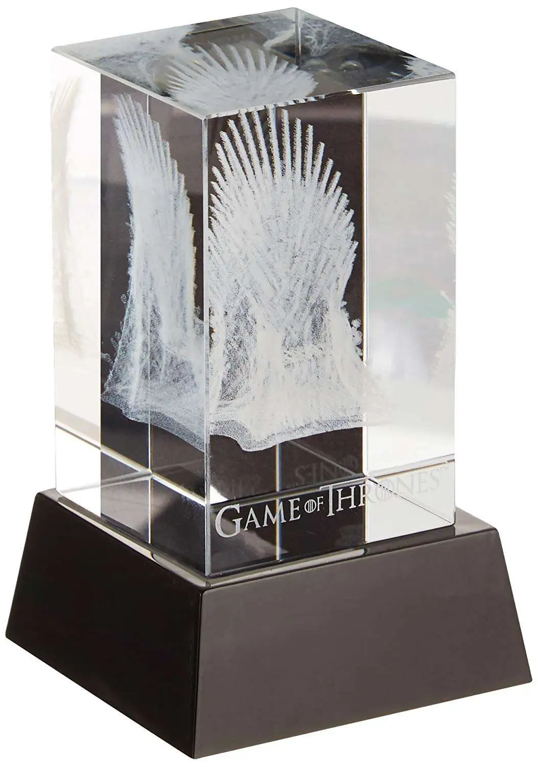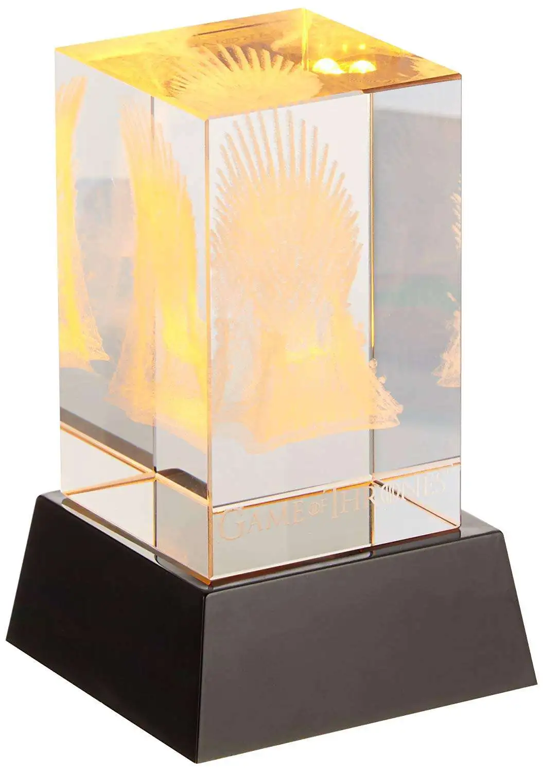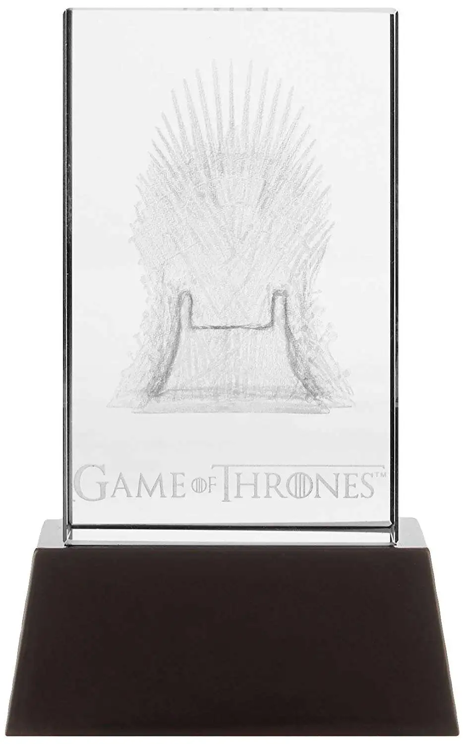 An otherworldly gold light illuminates the delicate, laser-etched swords of the iconic Iron Throne from the HBO series Game of Thrones in all their detail. The solid glass rectangular box measures 5 x 5 x 8 cm and sits on a discreet black base with a hidden gold LED element. The stunning effect is best viewed in person; this was one of our most-anticipated items by retailers and fans who saw the prototype at conventions and trade shows.
