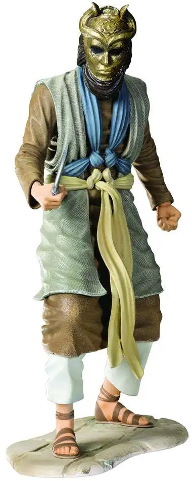 The Sons of the Harpy is an underground insurgency group composed of former slaves who are fighting the rule of Daenerys Targaryen over Meereen, composed of former slavers. They take their name from the harpy, the heraldic symbol of the slave masters in the Ghiscari cities of Slaver’s Bay. They conceal their identities by wearing golden masks with horned faces resembling harpies. Our detailed figure represents one of the many Sons of the Harpy seen on HBO’s adaptation of Game of Thrones.