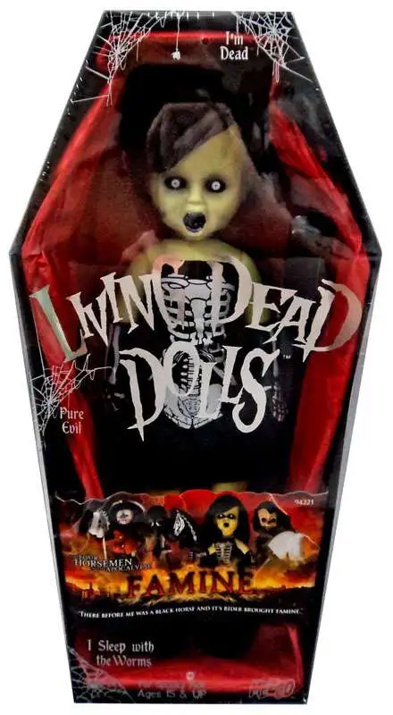 Just in time for the predicted end of the world, the Living Dead Dolls present the Four Horsemen Of The Apocolypse; War, Famine, Death, and Pestilance. Each doll comes complete with real cloth clothing and their own unique hobby horse. Pestilence also comes with a plague mask and War comes with a helmet and gas mask..