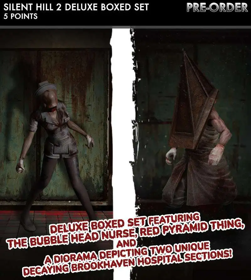 5 Points presents: Silent Hill Deluxe Boxed Set featuring the Bubble Head Nurse, Red Pyramid Thing, and a diorama depicting two unique decaying Brookhaven Hospital sections!