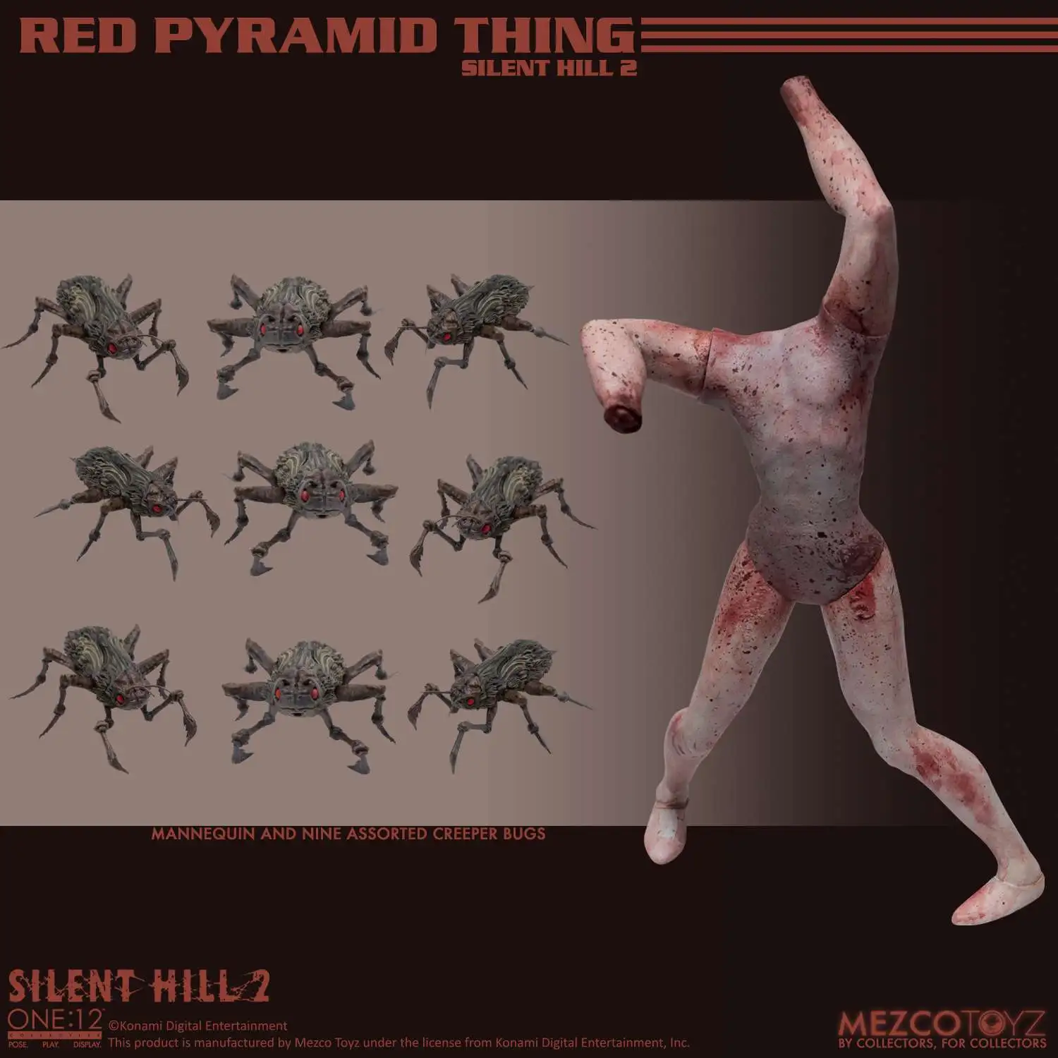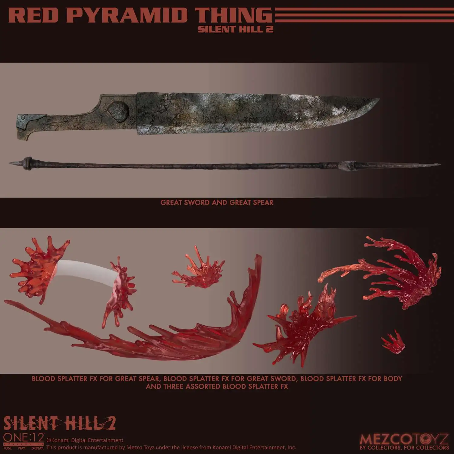The gruesome headsman, Red Pyramid Thing, slashes his way through the One:12 Collective! The One:12 Collective Red Pyramid Thing is outfitted in a weathered smock as seen in Silent Hill 2, and two interchangeable helmets. Silent Hill’s executioner comes complete with the tools of his macabre trade, including the Great Spear and Great Sword with blood splatter FX that attach to both weapons. The nightmare doesn’t end there – a Mannequin is included as well as a slew of Creepers. Red Pyramid Thing has become the most well-known monster in the Silent Hill franchise. As the manifestation of James Sunderland’s desire for punishment, the Red Pyramid Thing exists to remind James of his past actions and the included signature weapons are instruments of James’ inner torment. This approximately 7″ figure comes with a One:12 Collective body with over 20 points of articulation, two head portraits, hand painted authentic detailing, and 12 interchangeable hands. The costuming features a weathered smock, stained undergarment, combat boots & gloves. Accessories include a Mannequin, the Great Sword, the Great Spear; blood-splatter FX for the Great Spear, the Great Knife, and body; nine assorted Creepers; a One:12 Collective display base with logo and display post; and three miscellaneous blood spatter FX. Each One:12 Collective Silent Hill 2: Red Pyramid Thing figure is packaged in a collector friendly box, designed with collectors in mind.