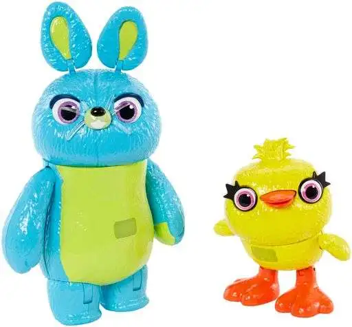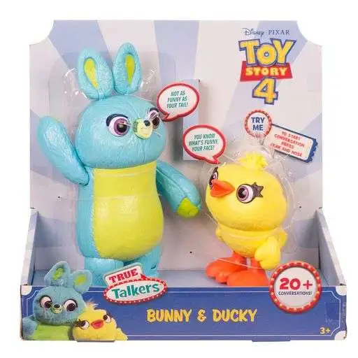 Recreate exciting carnival adventures from DisneyPixar Toy Story 4 with this talking, interactive character two-pack. Bunny and Ducky come in movie-inspired relative scale and have authentic colors and styling. Each figure speaks 20+ sounds and phrases for realistic play. Put them close and push their nose buttons to activate and hear them respond to each other. Hear Bunny say hilarious lines like, “Why you got to look at me like that?” and “Oh snap!” Push Ducky’s nose and he’ll reply, “Like what?” and “You stop lookin’ at me!” Recreate their hysterical scenes with these new, special Toy Story 4 talking toys!